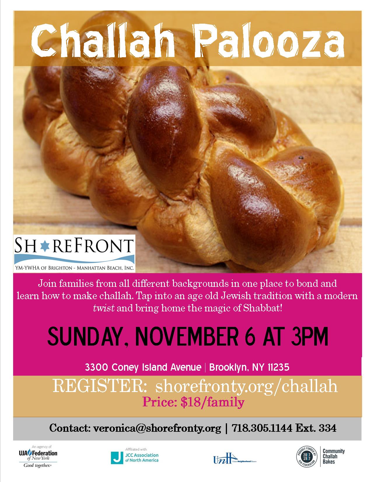 Challah Palooza at the Shorefront Y will be a fun Challah Baking event for the whole family. Learn to make challah using traditional and innovative challah recipes that come from both modern cooks and our traditionally Russian-Jewish community. Tap into an age old Jewish tradition with a modern twist and bring home the magic of Shabbat!